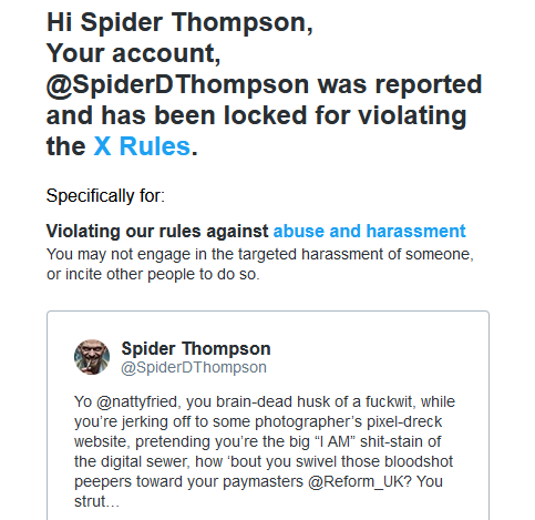 I’m not having it. I fire back at Fried with a screenshot of Reform’s GDPR-violating website and tell him to ask his bosses why they treat data laws like optional trivia. An hour later – ping – X emails me: “Hi Spider Thompson, Your account, @SpiderDThompson, has been locked for violating the X Rules.” My crime? Calling out Fried’s hypocrisy. Apparently, his snowflake ego couldn’t handle the truth, so he reported me, and X rolled over like a trained dog. Meanwhile, Fried’s still prancing around, untouched, and Reform carries on flouting GDPR like it’s a suggestion box.