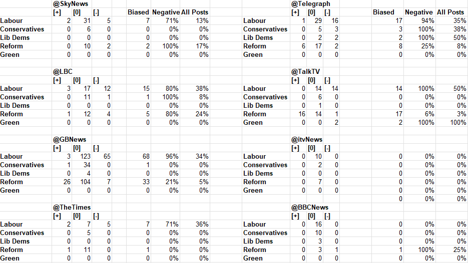 @LBC, though? They’re flinging shit at Labour like it’s a goddamn monkey cage. Nearly as many hit pieces as neutral ones, and the two “positive” posts they managed? Probably hurt their blackened souls to type. Weirdly, they also lobbed some crap at Reform, but it’s mostly neutral noise—like they’re hedging their bets to look less like sellouts.