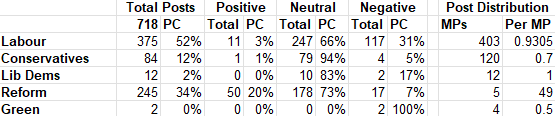 So, what’s the spin? I grabbed 718 posts from the usual suspects—your Sky News, your GB News, your copy-paste “journalists” who think reposting the same video ten times is a personality trait. I slapped a simple lens on it: positive, neutral, negative. If you’re a real journalist, your shit should be neutral—facts, truth, no bullshit. Positive is when you’re shilling for a party, letting them spew their garbage unchallenged, giving them a megaphone to scream their dogma. Negative is a hit piece—headlines like “Budget Bankrupts Britain!” with no stats, no proof, just a journalist’s hot take dressed up as gospel. That’s not news; that’s propaganda with a better haircut.